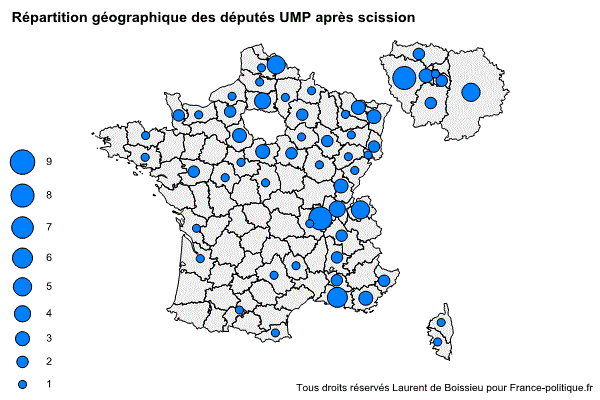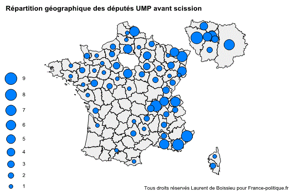 Après la création du groupe Rassemblement - UMP à l'Assemblée nationale (68 députés sur 194), sous la présidence de François Fillon, voici l'implantation départementale des deux groupes UMP: