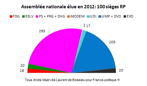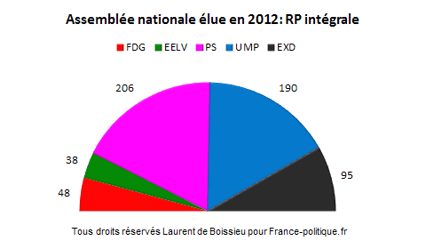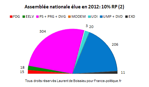 - Pour info, deux autres simulations donnant des résultats assez différents: RP intégrale selon Le Figaro ici ("scrutin proportionnel plurinominal départemental à un tour" avec "dans chaque département un seuil de représentation lié au nombre de postes disponibles" sic!) et 100 députés élus à la RP selon France Télévisions là (ayant opéré le choix de rattacher le MIM à EELV et non au FDG, ainsi, plus étrangement au regard de la réalité politique et électorale, que le MoDem à l'UDI).